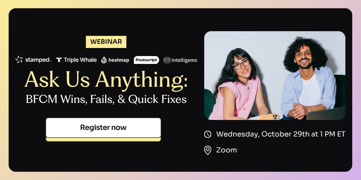 Join us, Stamped, Triple Whale, Postscript, and Intelligems for a live, for a live, unscripted Q&A session where we’ll tackle your biggest BFCM questions, from campaign timing to post-holiday follow-ups.